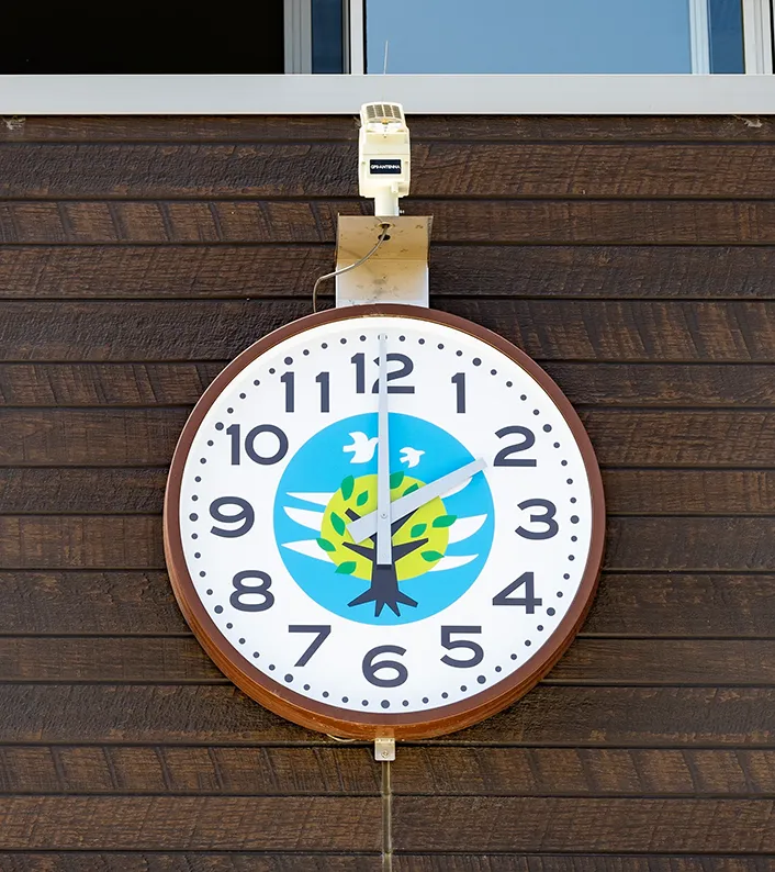 こどもたちへの想いが詰まった「うみの風こども園」のロゴマークを中心に大きく配置したデザイン時計です。