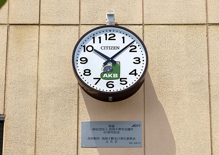 我孫子駅北口美化委員会「AKB会」のロゴが文字板に取り入れられた時計です。